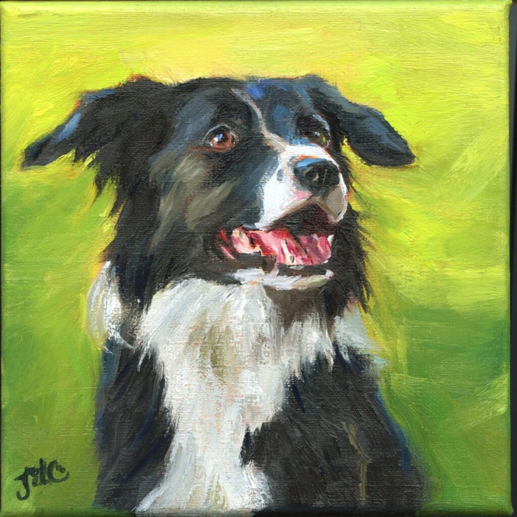 Border Collie Olieverf op linnen 3D (4cm dikke rand) Methode: losse pols alla prima Van Beek classic linnen 100% 340grs Met ophangsysteem Referentie en n.a.v. online workshop van TJ Cunningham In mijn shop te koop